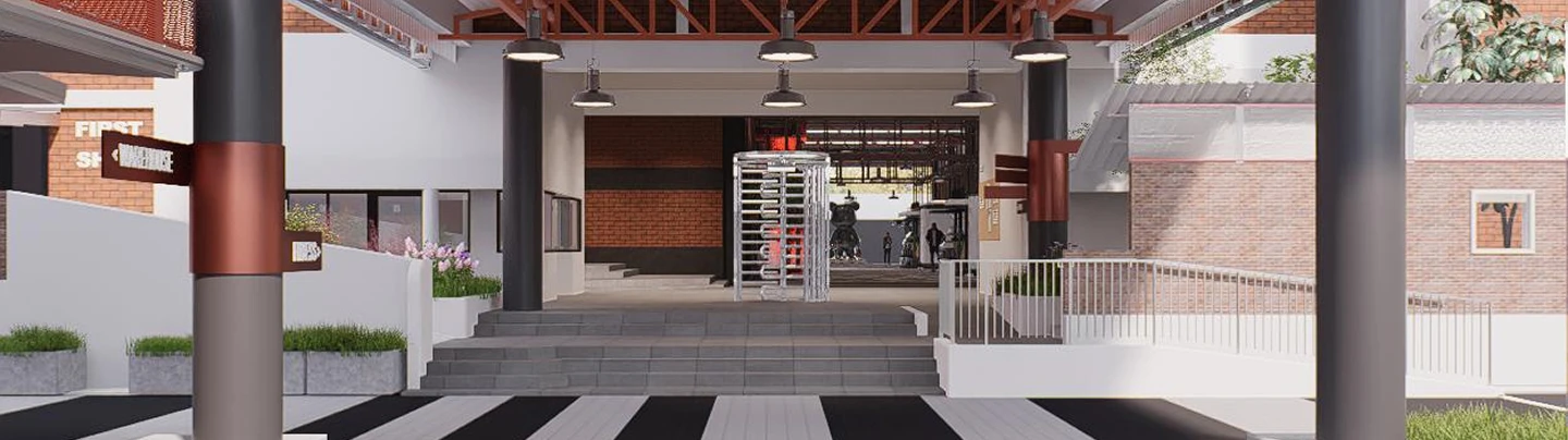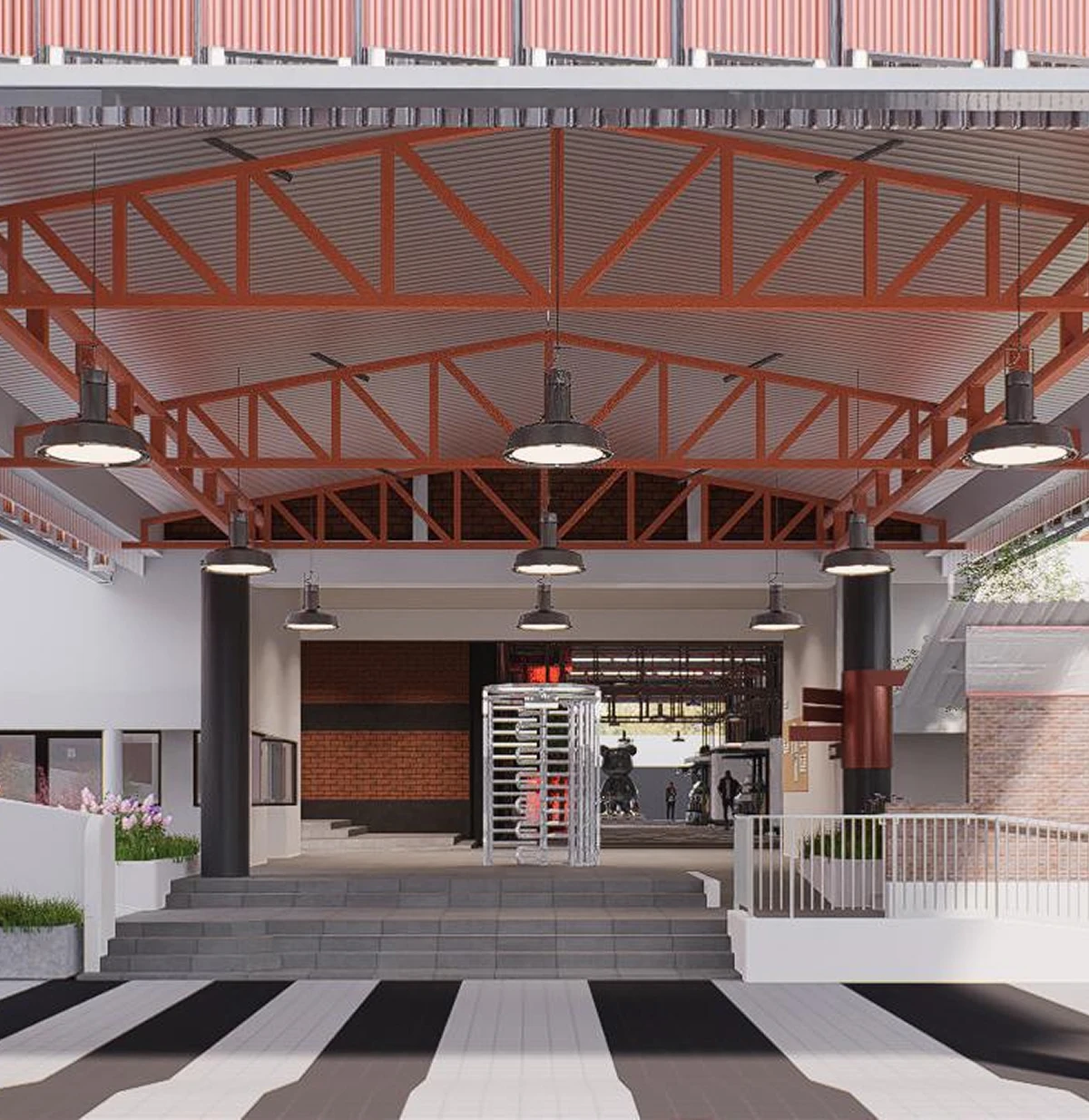 It preserves the factory's original grit, showcased through its red bricks, exposed steel and gantry structures, which is then injected with vibrant life through bold typographic murals, playful and interactive sculptures crafted from repurposed materials, and modular scaffolding systems that serve as both retail frames and metaphors for transformation.